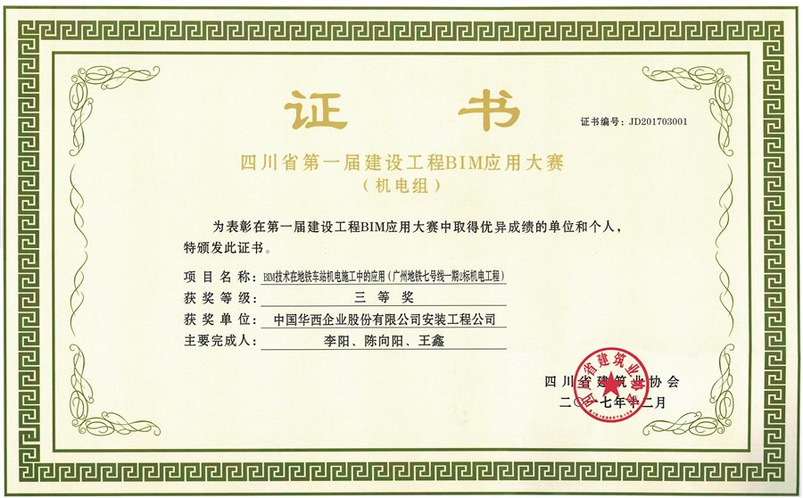 | 7 | 四川省第二屆建設工程BIM應用大賽機電組二等獎 | 省級 | 2018年12月 |