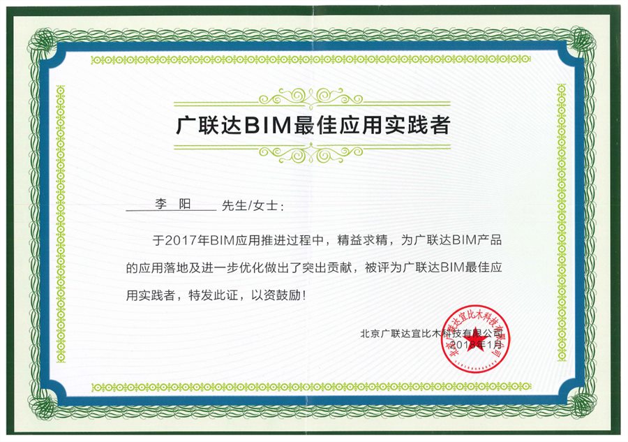 | 13 | 廣聯(lián)達BIM最佳應用實踐者(李陽) | 企業(yè)級 | 2018年1月 |
