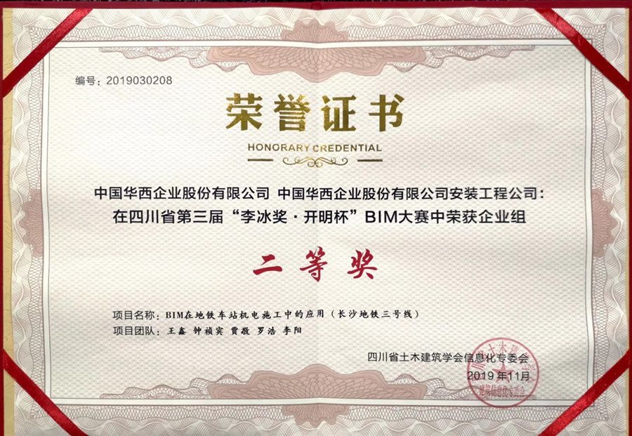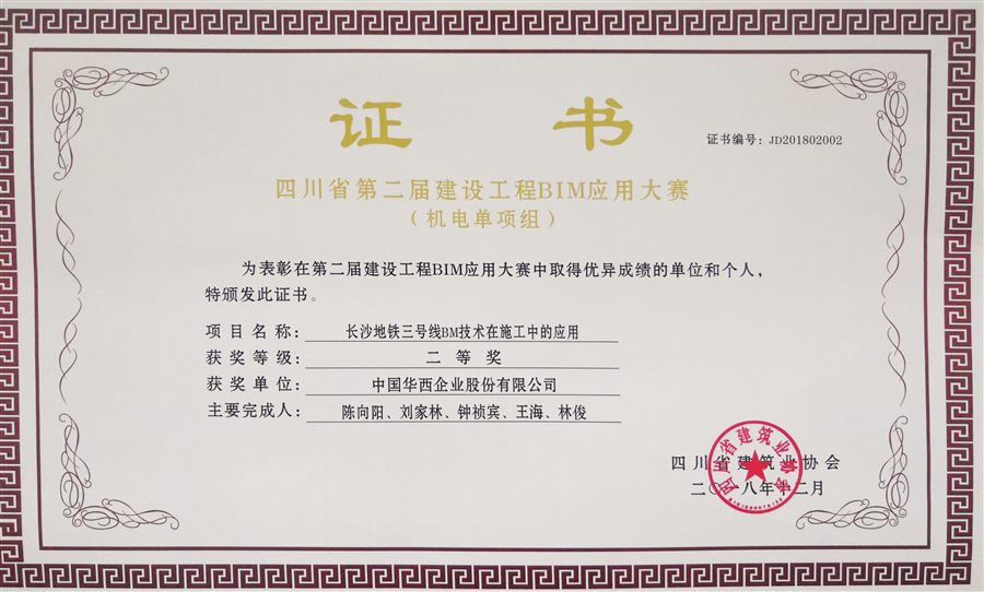 | 9 | 四川省第三屆“李冰獎-開明杯”BIM大賽企業(yè)組二等獎(長沙地鐵3號線) | 省級 | 2019年6月 |