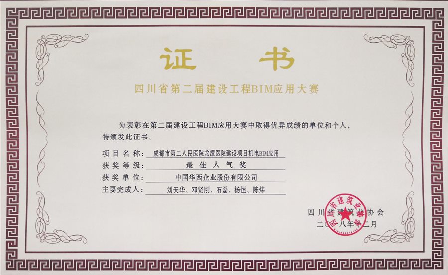 | 8 | 四川省第二屆建設工程BIM應用大賽最佳人氣獎 | 省級 | 2018年12月 |