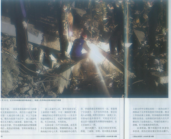 2008年第18期《三聯(lián)生活周刊》登載的我公司人員在北川中學(xué)抗震救災(zāi)照片